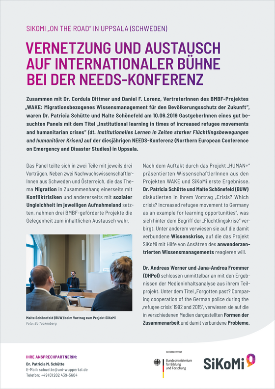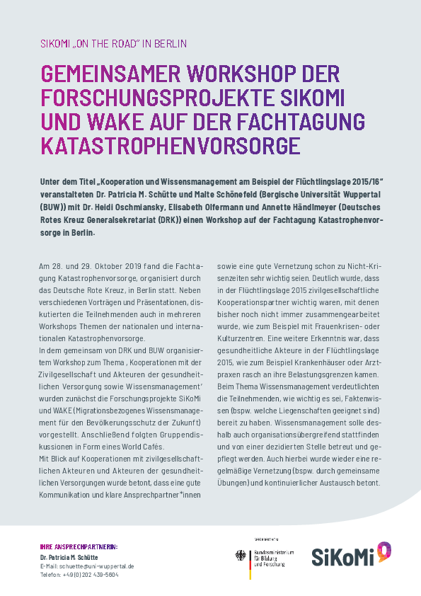 Am 18./19.11. fand gemeinsam mit dem Verbund WAKE (Migrationsbezogenes Wissensmanagement für den Bevölkerungsschutz der Zukunft) die Abschlusskonferenz des BMBF-Forschungsprojekts SiKoMi statt. Die Veranstaltung stand unter der projektübergreifenden Thematik „Flüchtlingslage 2015/2016 – Perspektiven, Ansätze, Lessons Learned für BOS und andere Sicherheitspartner“. An zwei Tagen präsentierten die beiden Verbünde ihre Ergebnisse den rund 150 Teilnehmenden. Die zusammenfassende Abschlussdokumentation findet sich hier.